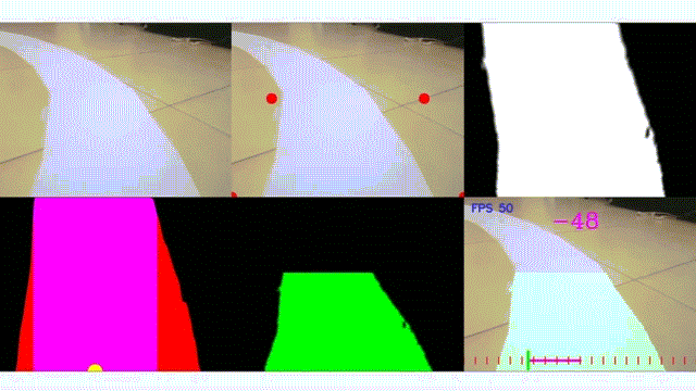 The picture above shows all the white pixels with 255 value and all the black with 0. Now if we sum the pixels in first column it yeilds 255+255+255+255+255 = 1275. We apply this method to each of the columns. In our original Image we have 480 pixels in the width. Therefore we will have 480 values. After summation we can look at how many values are above a certain threshold hold lets say 1000 on each side of the center red line. In the above example we have 8 columns on the left and 3 columns on the right. This tells us that the curve is towards left. This is the basic concept, though we will add a few more things to improve this and get consistent results. But if we look deeper into this we will face a problem. Lets have a look.