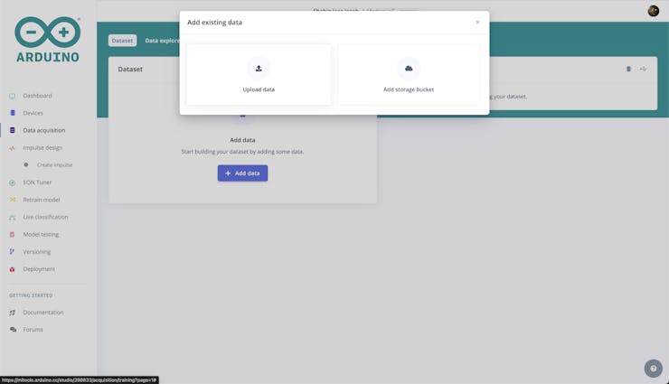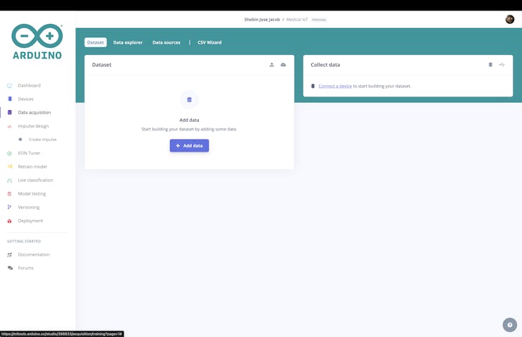 We are using this dataset for our TinyML model training. To upload the data navigate to the Data Acquisition tab.