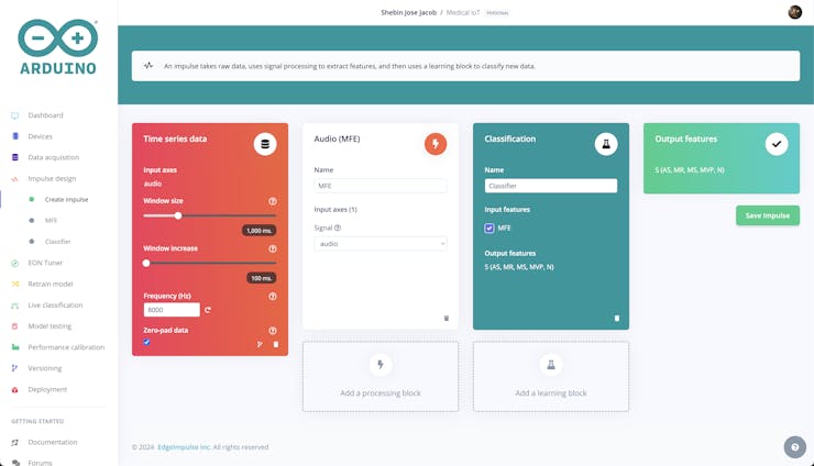 Finally, for the learning block, we are using a Classifier block. This type of algorithm is designed to assign data to one of several predefined categories, and it is well-suited for the task of classifying heart sounds into one of five categories. By using classification as the learning block, we can categorize the heart sounds into one of five classes.