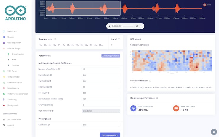 For our processing block, we've selected Audio MFCC. MFCC stands for Mel-frequency cepstral coefficients. It's a feature extraction technique widely used in audio signal processing and speech recognition. MFCCs are derived from the short-term power spectrum of a signal, mimicking the human auditory system's response to sound. The process involves several steps, including applying a mel-filterbank to the power spectrum, taking the logarithm of the filterbank outputs, and performing a discrete cosine transform (DCT) to decorrelate the coefficients.