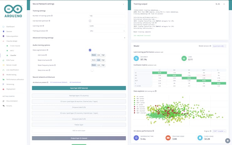 With the generated features ready, the next step is to proceed with training the model. Navigate to the Classifier Tab. Within this tab, you'll encounter three parameters and two architecture presets. These parameters and presets can be adjusted and experimented with until you achieve a satisfactory level of accuracy. Our training settings have yielded a model with an impressive training accuracy of 97.1%.