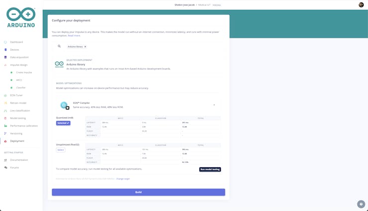 From the Deployment tab, build an Arduino Library. You can enable optimizations with EON Compiler if you like but is optional.