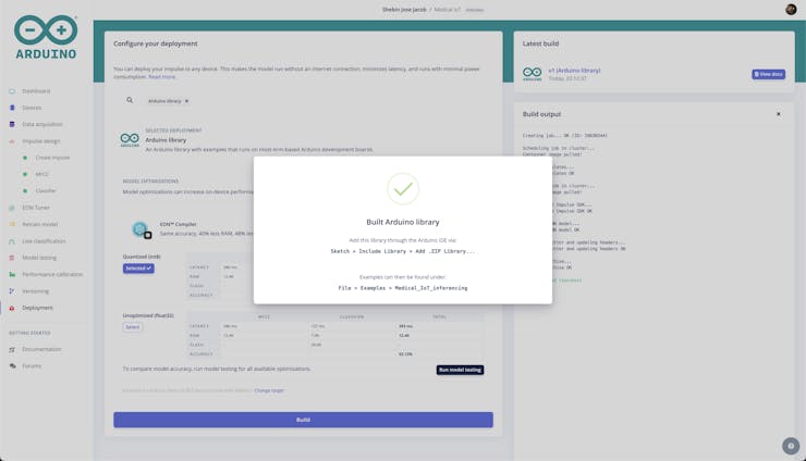 The build will output a zip file containing the model and some examples. Add the library to Arduino IDE using Sketch > Include Library > Add.ZIP library