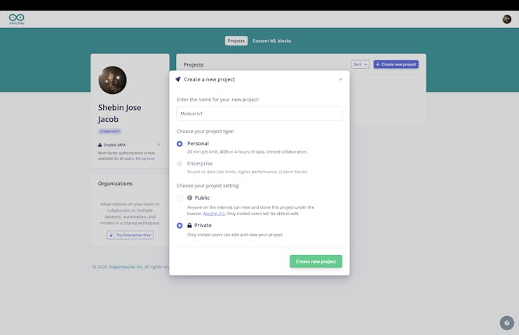 Training a TinyML model using Edge Impulse involves several steps, from data collection and preprocessing to model training and deployment. Let's start by creating the project on Edge Impulse Integration on Arduino Cloud.