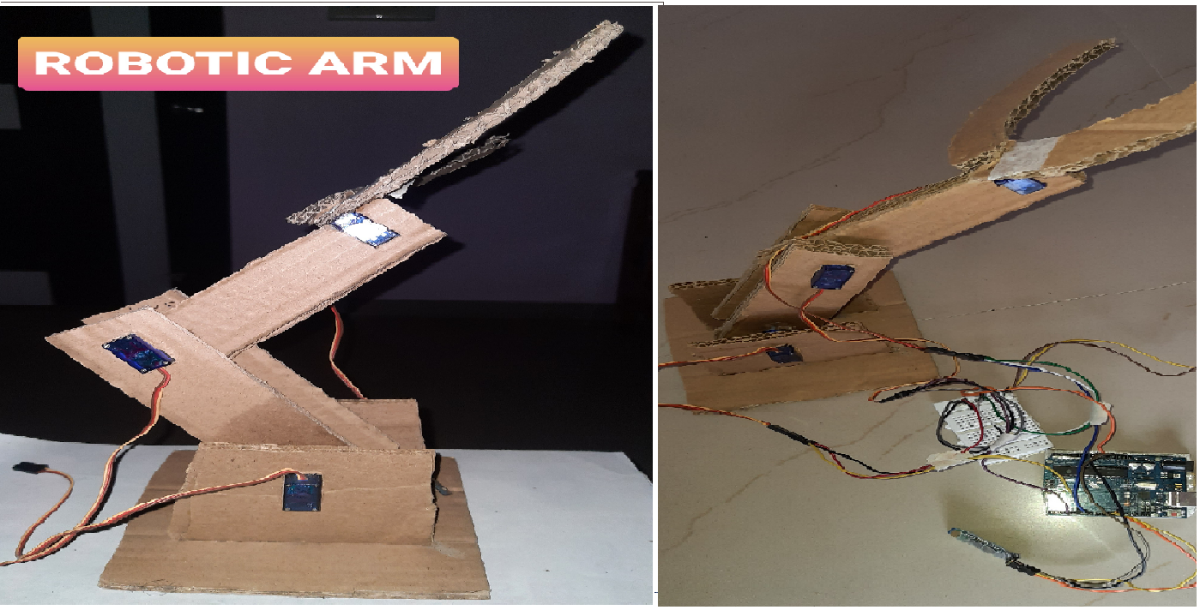 I made the robotic arm from the waste carboard. Placing the 3 servo motors at appropriate places and connecting them as per the circuit diagram I made a robotic arm .