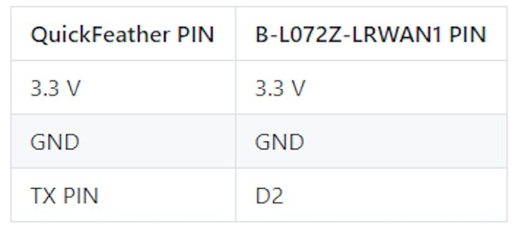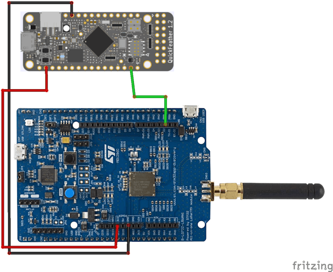 In order to send the results of the model to the B-L072Z-LRWAN1, we connect the TX pin of the board, which has a serial output at 460800 baud rate to the D2 pin as shown in the diagram.