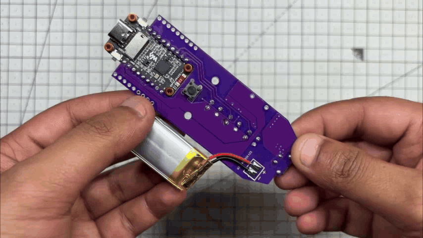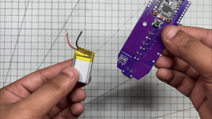 - A strip of double-sided tape is applied to the back of the LiPo cell, which is then pressed firmly onto the circuit to hold it in place.