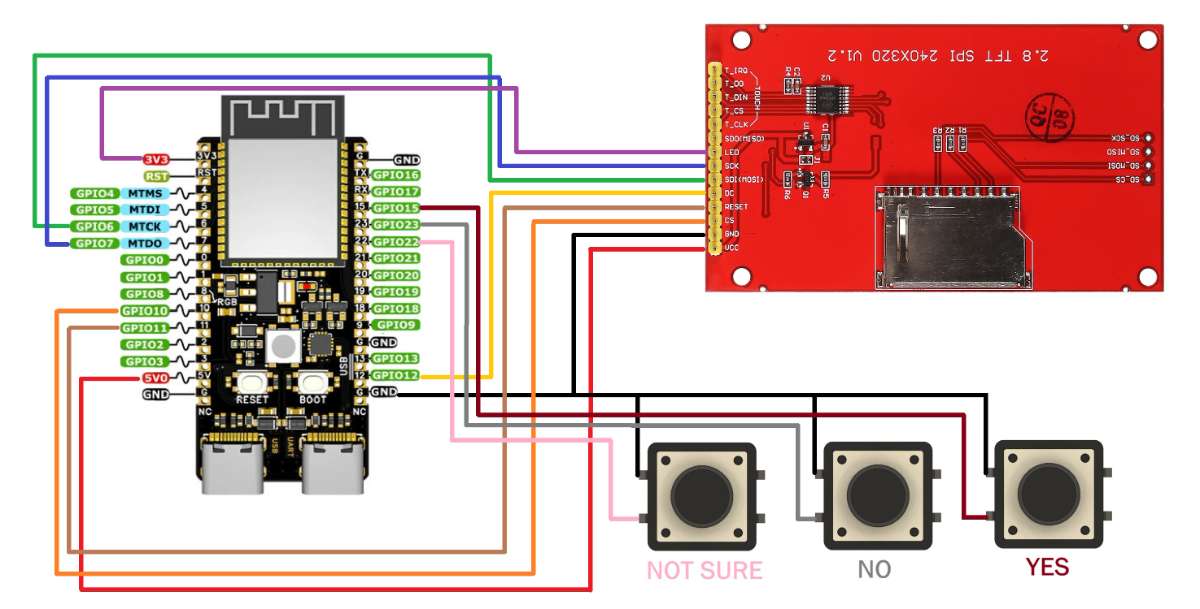 For user interaction, I added three tactile buttons—Yes, No, and Not Sure—mapped to GPIO pins. This setup served as our base model for testing the core logic and UI flow.