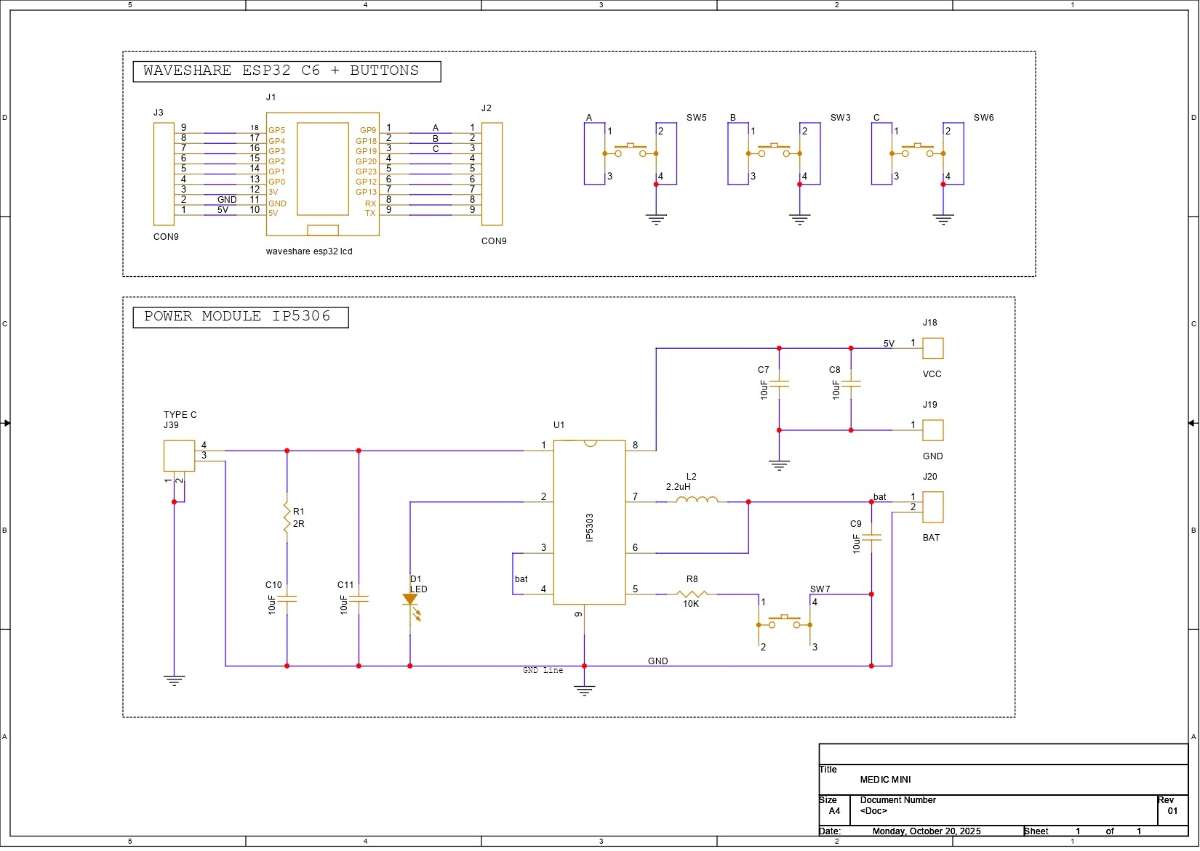 At its core, Medic Mini runs on an ESP32-C6 paired with a 1.47" Waveshare display, housed inside a custom PCB and a 3D-printed enclosure I designed from scratch. The interface is clean and purposeful: users are prompted with one symptom at a time and respond using three tactile buttons—Yes, No, or Not Sure.