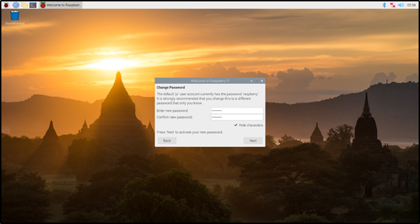 The next screen will prompt you to change your password. The default username is “pi” and the default password is “raspberry”