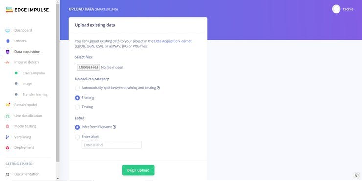 To make the machine learning model it's important to have a lot of images of the products. When training the model, these product images are used to let the model distinguish between them. Make sure you have a wide variety of angles and zoom levels of the products which are available in the shops. For the data acquisition, you can capture data from any device or development board, or upload your existing datasets. So here we are uploading our existing datasets.