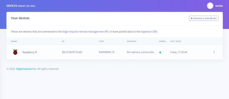 That's all! Your device is now connected to Edge Impulse. To verify this, go to your Edge Impulse project, and click Devices. The device will be listed here.