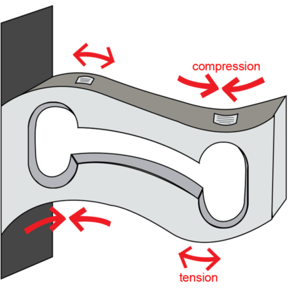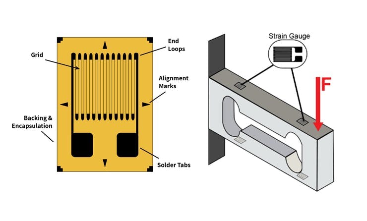 When the load is applied to the body of a resistive load cell, as shown above, the elastic member, deflects as shown and creates a strain at those locations due to the stress applied. As a result, two of the strain gauges are in compression, whereas the other two are in tension.