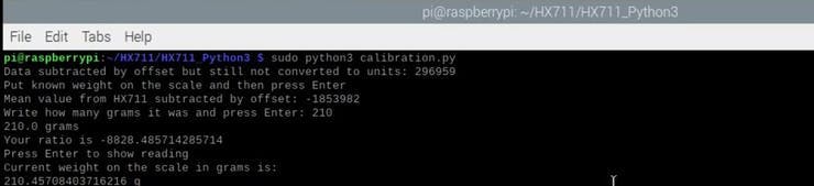Connect the load cell, HX711 module to the Raspberry pi as per the schematics and run the calibration.py code in raspberry pi. Then you will get the ratio of your own load cell and just put in it your main code. Each load cell ratio would be different on different occasions. Below is my calibration of the load cell.