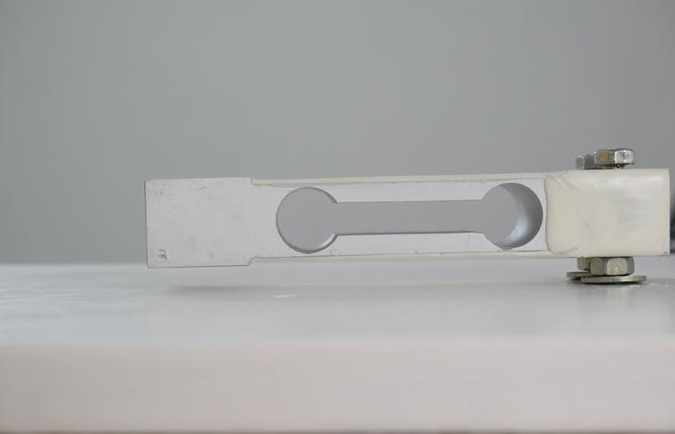 During a measurement, the weight acts on the load cell’s metal spring element and causeselastic deformation. This strain (positive or negative) is converted into an electrical signal by a strain gauge (SG) installed on the spring element. The simplest type of load cell is a bending beam with a strain gauge. We use the Wheatstone bridge circuit to convert this change in strain/resistance into a voltage that is proportional to the load.