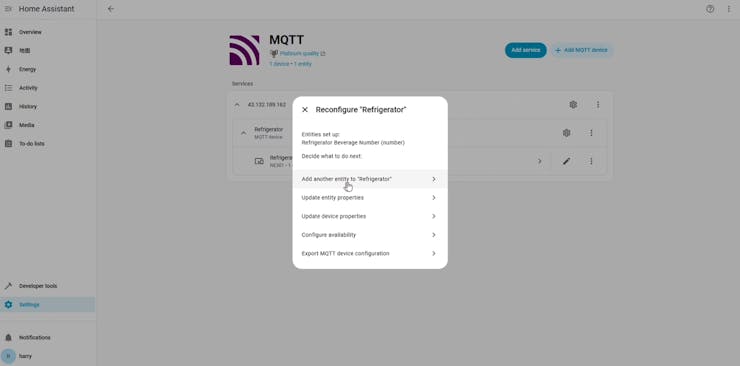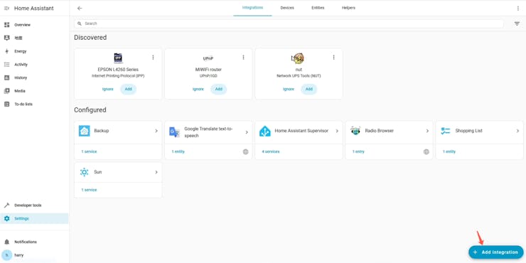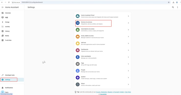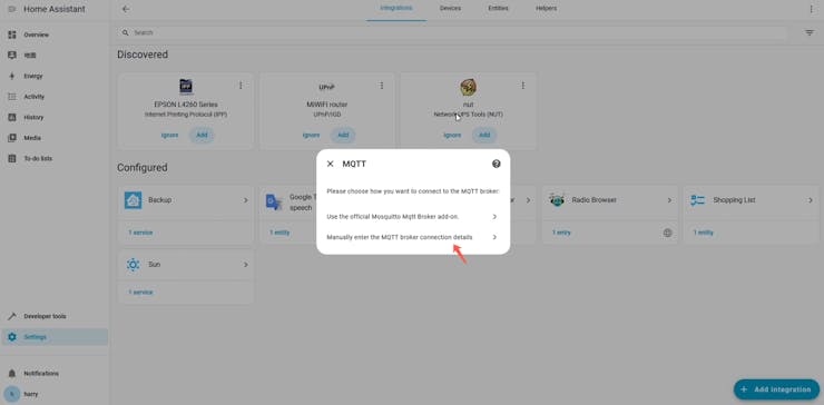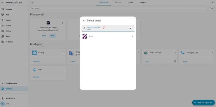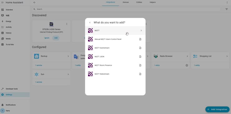 Open the 'Devices & Services' to install the MQTT integration.
