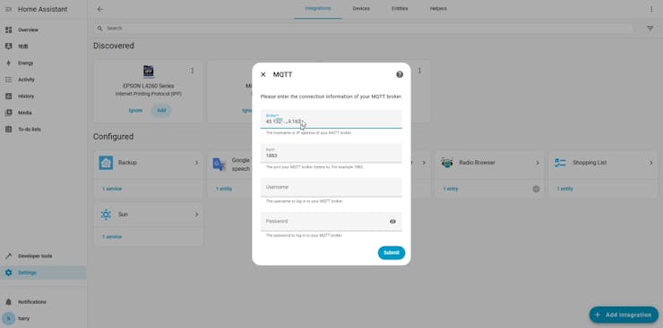 Click Add Integration button to install the MQTT addon.
