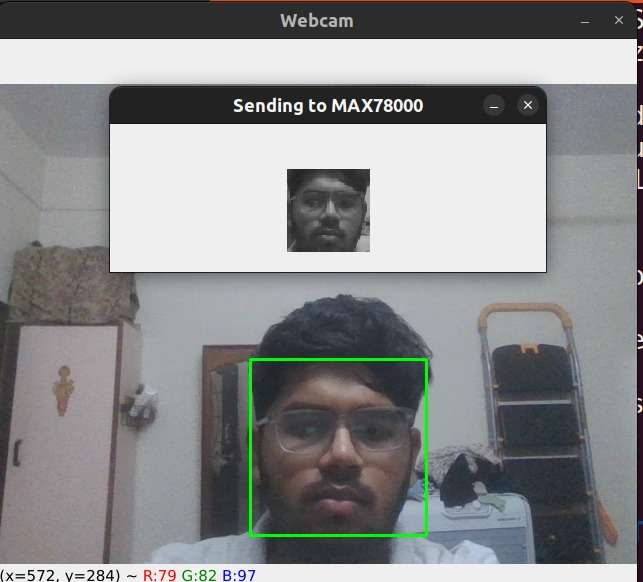 The HM01B0 camera streams grayscale frames directly into the MAX78000’s convolution accelerator.