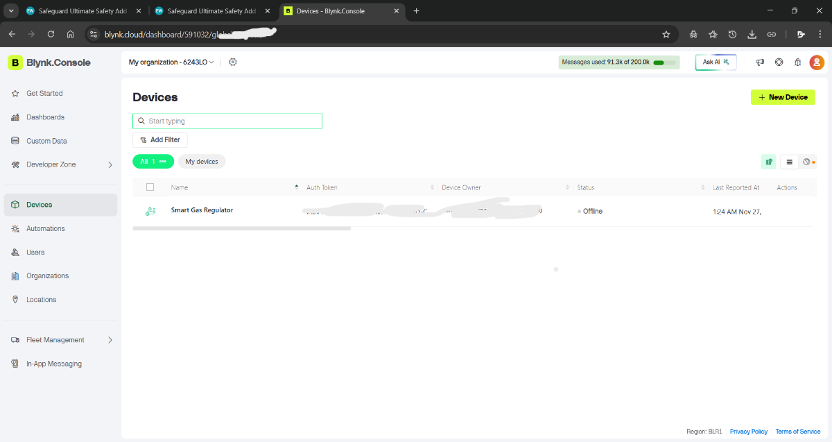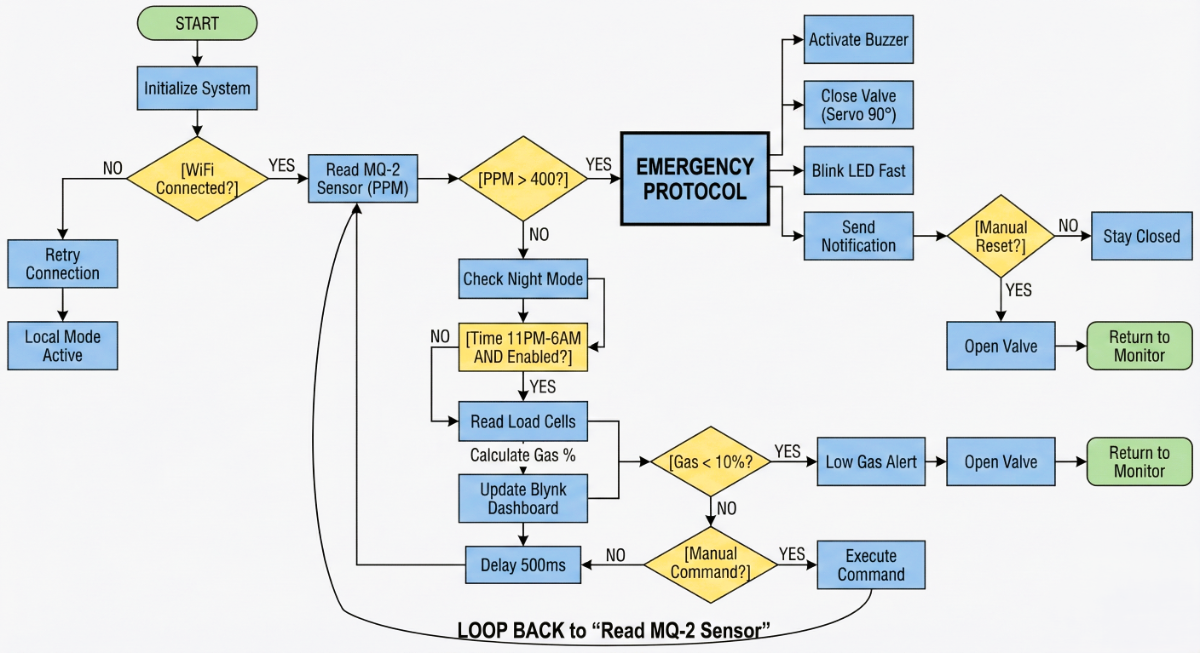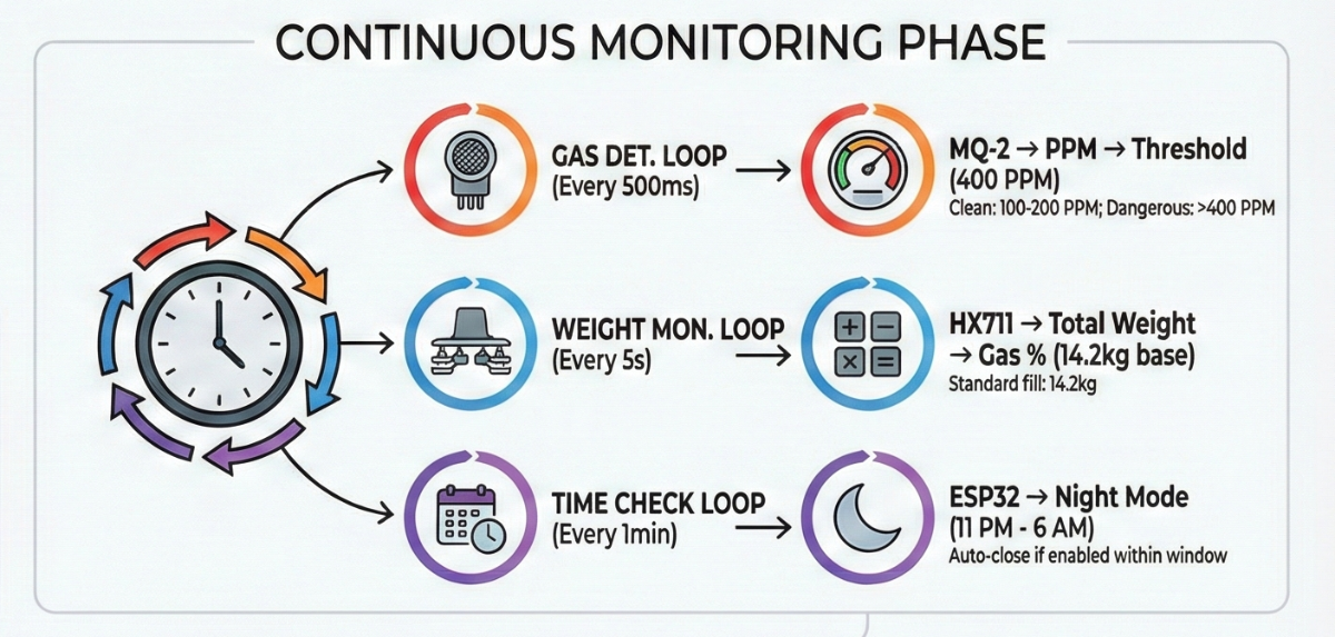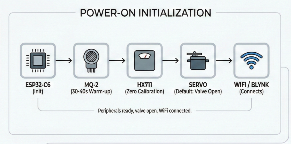 Power-On Initialization: When SafeGuard boots up, the ESP32-C6 initializes all peripherals. The MQ-2 sensor provides usable readings after just 30-40 Seconds of warm-up. The HX711 performs a zero calibration, and the servo -moves to its default position (gas valve open). WiFi connects to your home network, and the Blynk app establishes communication.