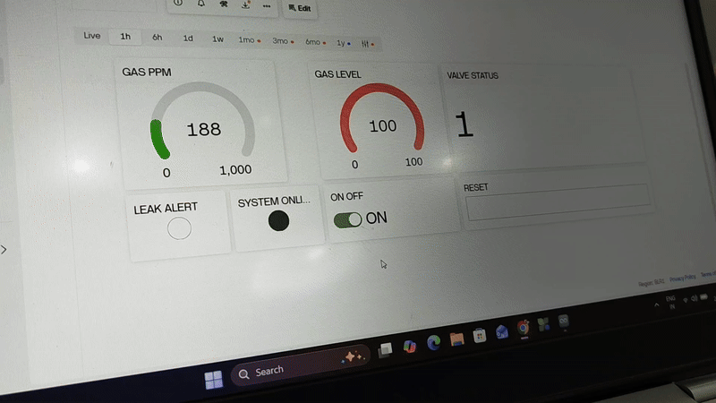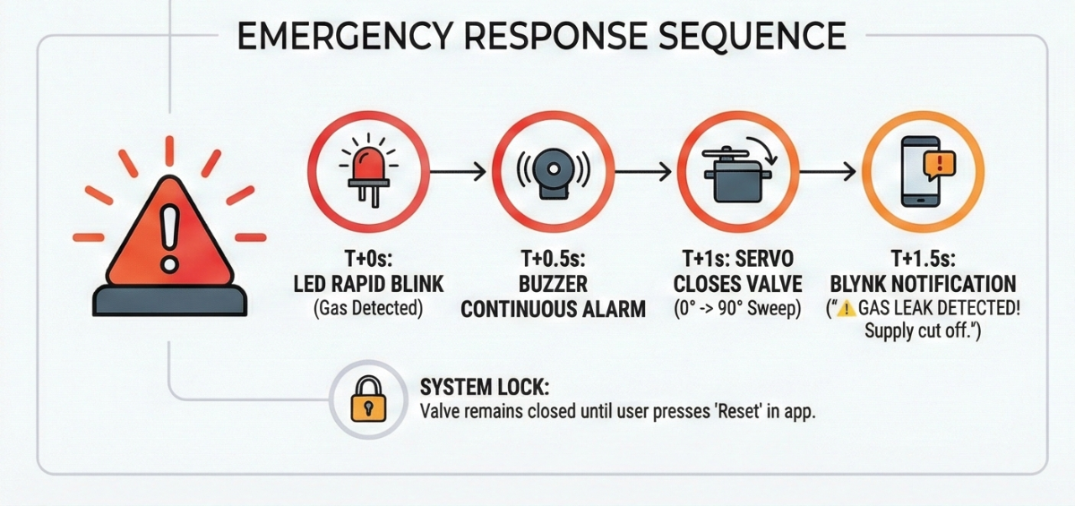 - T+1.5 seconds: Blynk notification sent: " GAS LEAK DETECTED! Supply cut off."
