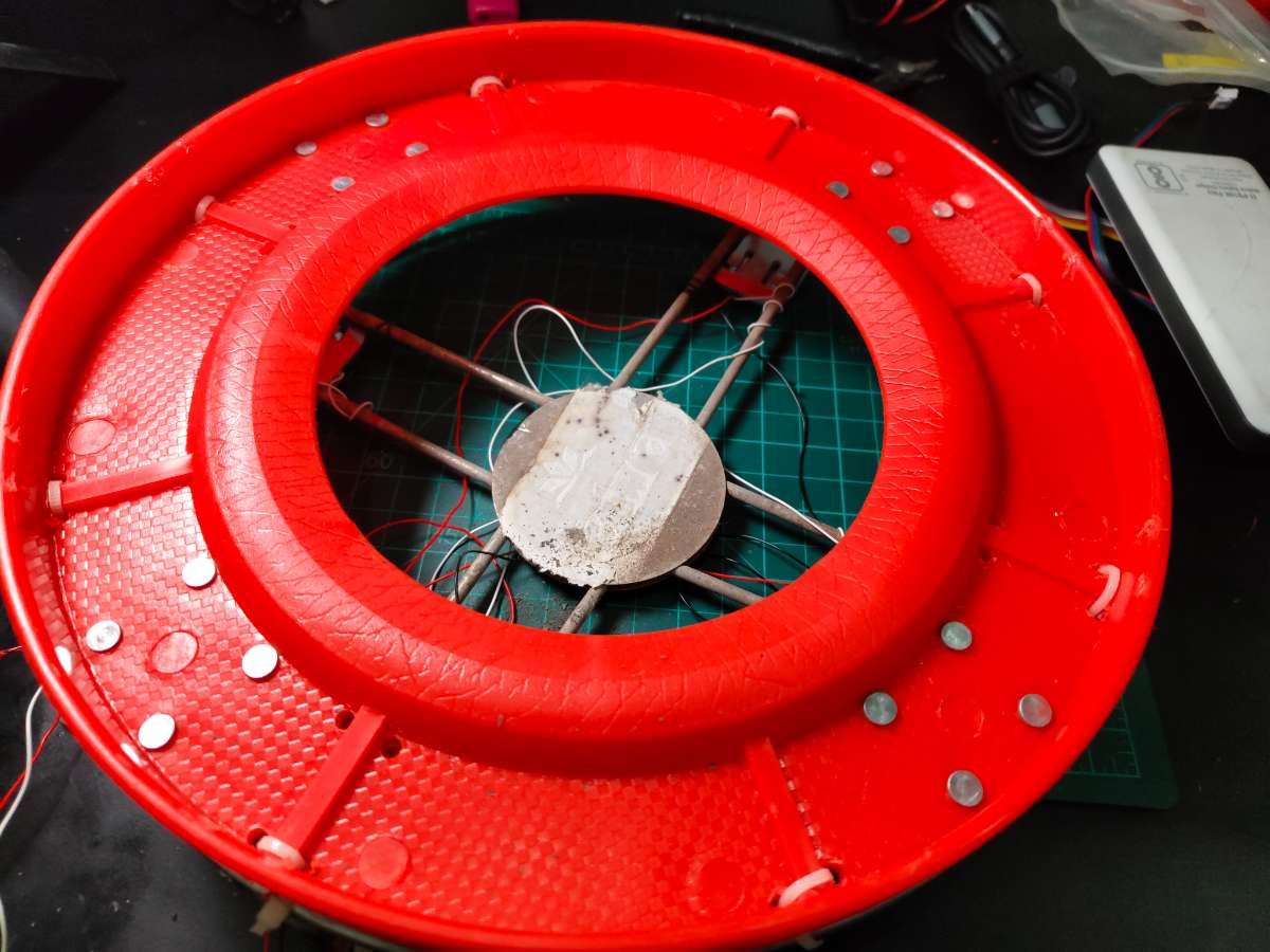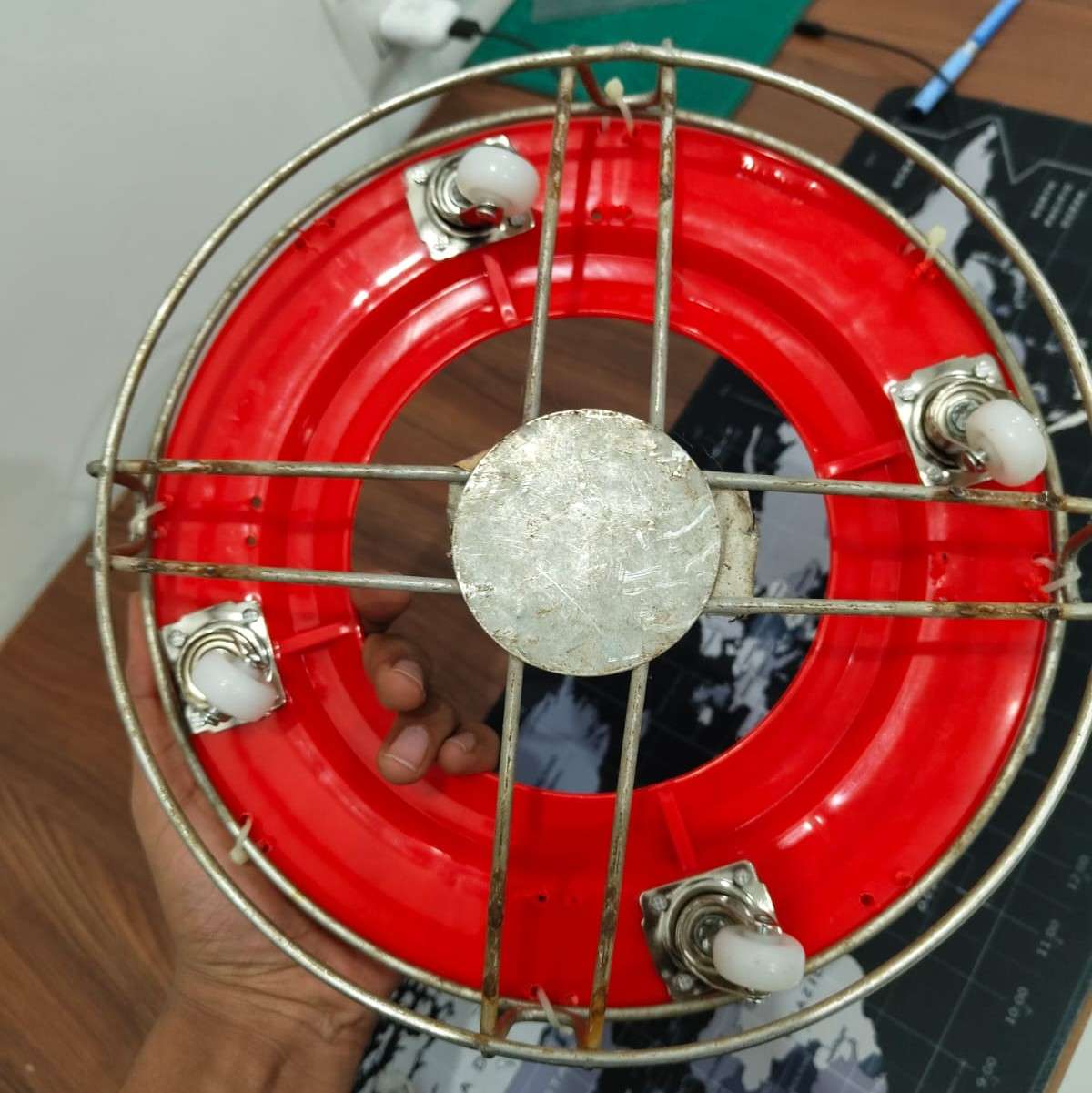 I Had A Circular Plastic LPG Cylinder With Wheels Stand At Home, I thought I Can adjust The electronics under it , but there was no space for it, then I started designing Solution for base And I Found Another Steel Base Used As Cylinder Stands And I Removed Its Wheels And Combined it With Some Drilled Holes And Zip Ties.