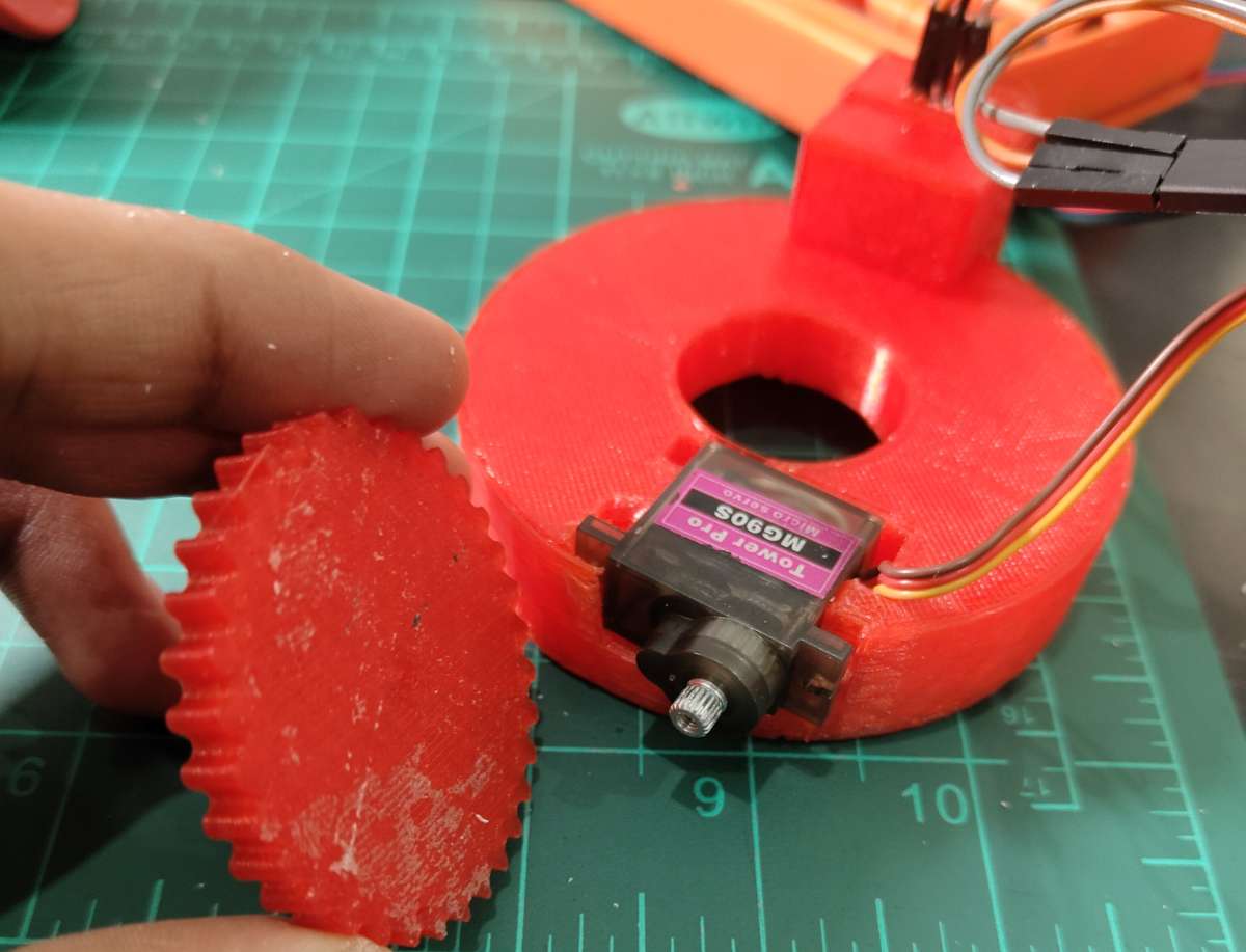 The Gear Design Failed Because the servo motor was not generating enough thrust to rotate the Knob Because The gear was too big and the thrust was not enough At the end.