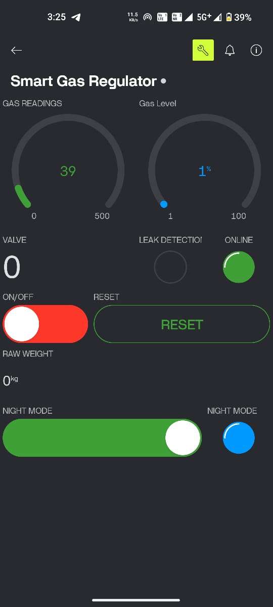 Normal Operation: Under safe conditions, the app displays real-time gas percentage, current PPM reading, and valve status. Users can manually open/close the valve, toggle night mode, and adjust settings. Low gas alerts trigger automatically when levels drop below 10% (approximately 1.4kg remaining).