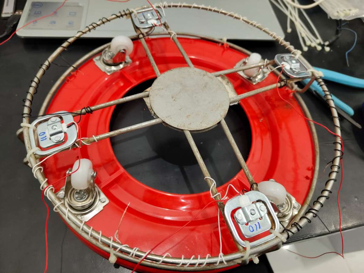 Each load cell sits equally from the platform center. This positioning ensures the cylinder's weight distributes evenly across all four sensors regardless of where you place it on the platform.