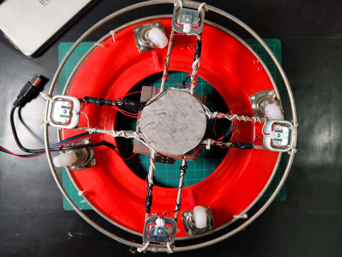 The load cells attach using Zip ties through the platform and into the load cell's Outer Body. Each load cell's sensing element faces Downward—this is critical because they're designed to measure compression force applied to the top surface.
