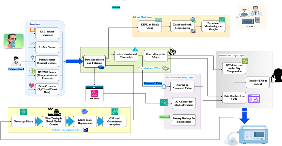 Portable ventilator system that combines real-time patient monitoring, automated ventilation control and cloud connectivity. The device collects data from multiple sensors such as heart rate, ECG and temperature, filters it, and applies safety checks to detect abnormal conditions. Based on this data, the ESP32 controls a motor-driven Ambu bag mechanism to maintain accurate and safe ventilation. All readings are synced to a secure cloud dashboard, allowing doctors to monitor patients remotely . Designed for scalability, it can be deployed from prototypes to rural centers and large-scale healthcare environments.