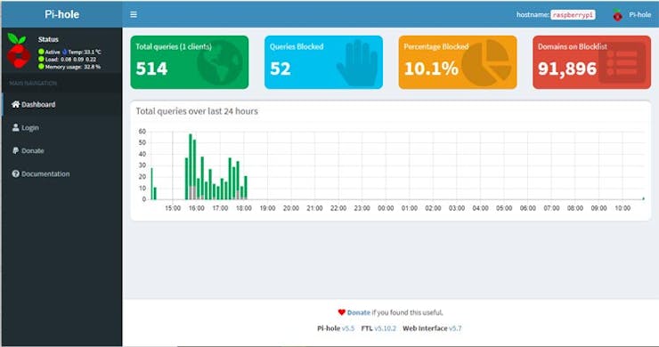 4- Now, open a web browser on your computer and type in the IP address of your Raspberry Pi, followed by an admin ending, such as http:// 192.168.198.38/admin/. The Pi-hole web page will appear in your browser.