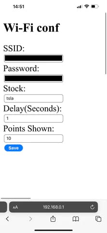 Once it has rebooted it should automatically connect and start showing stock data. For future configuration press the button at the back and it would show its current information