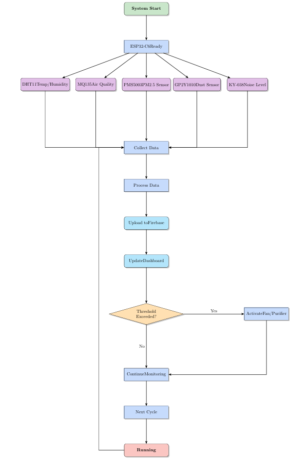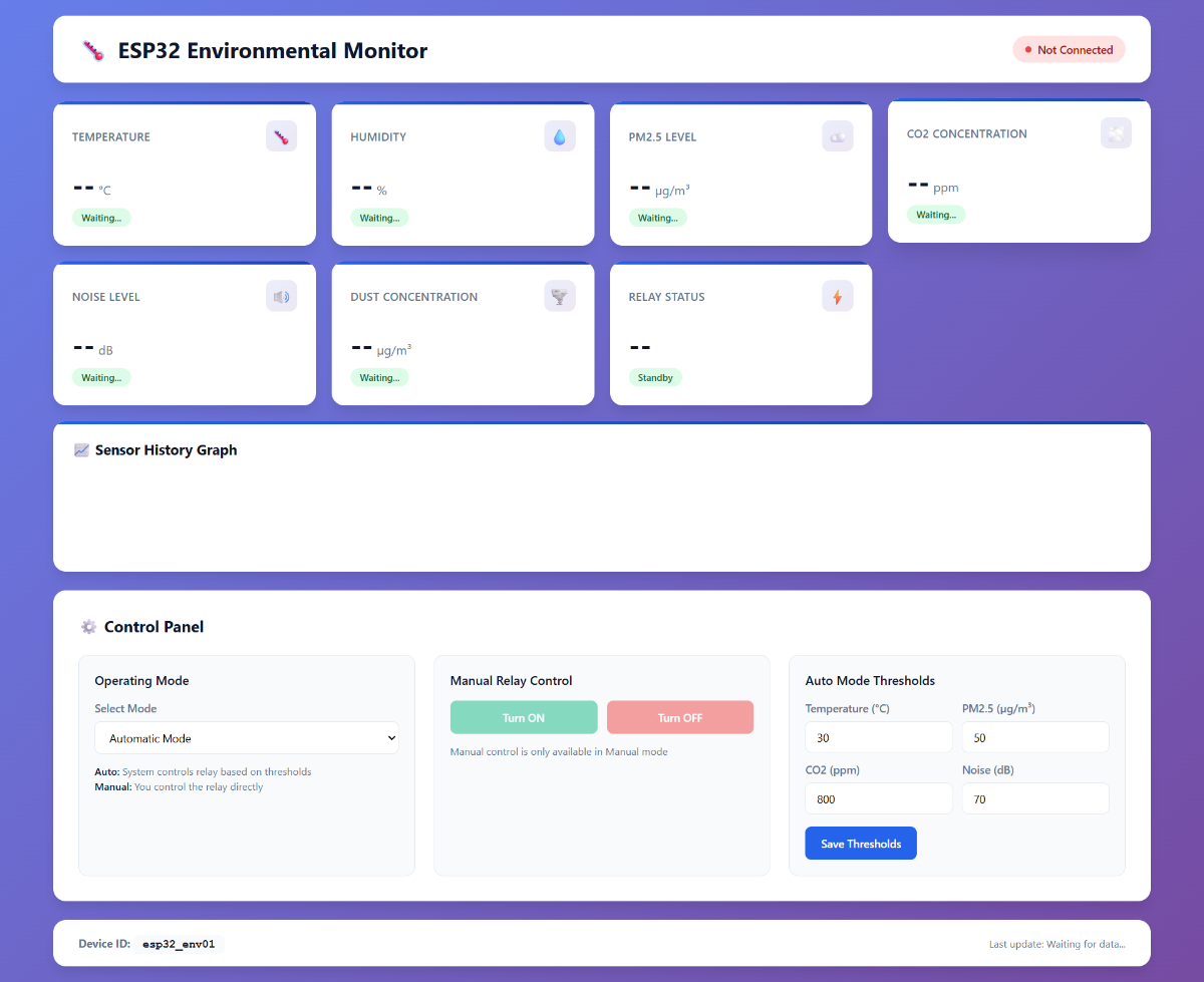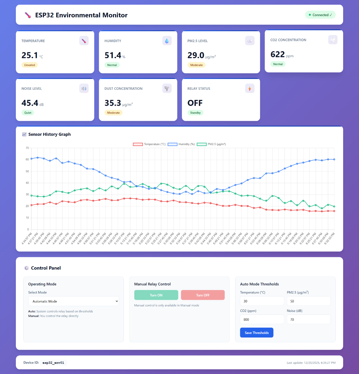 This project showcases a comprehensive Internet of Things (IoT) environmental monitoring solution, built on the ESP32-C6 microcontroller. The system continuously monitors five critical environmental parameters—temperature, humidity, air quality, particulate matter, and noise levels—and transmits this data to the cloud in real-time.