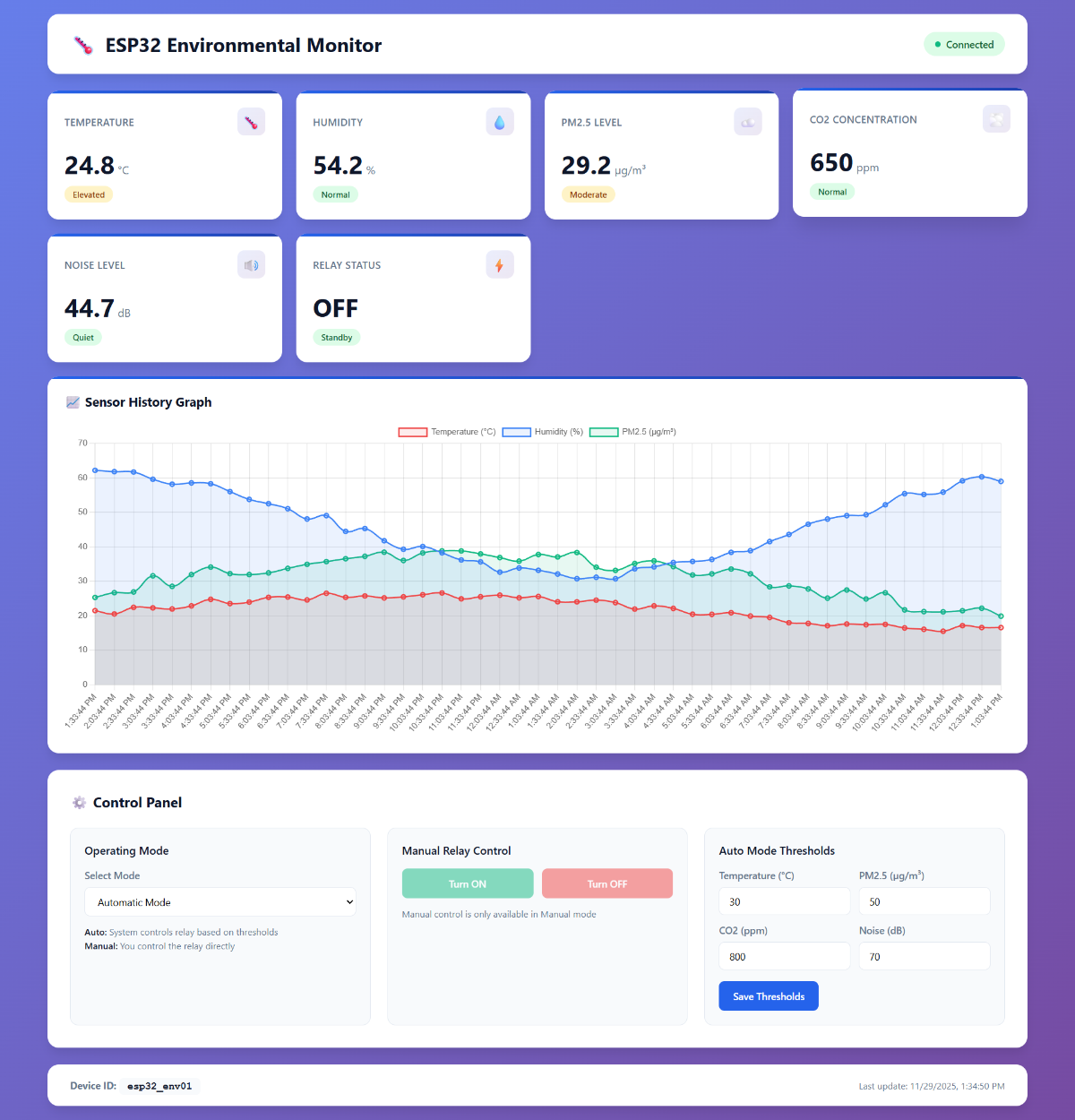 This project demonstrates a complete Internet of Things (IoT) environmental monitoring solution built on the ESP32-C6 microcontroller. The system continuously monitors five critical environmental parameters—temperature, humidity, air quality, particulate matter, and noise levels—and transmits this data to the cloud in real-time.