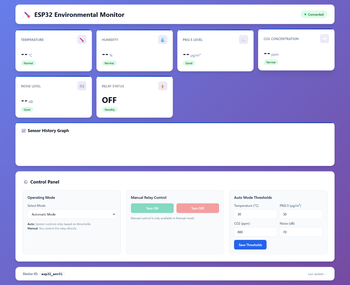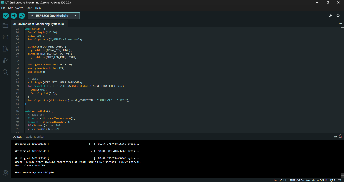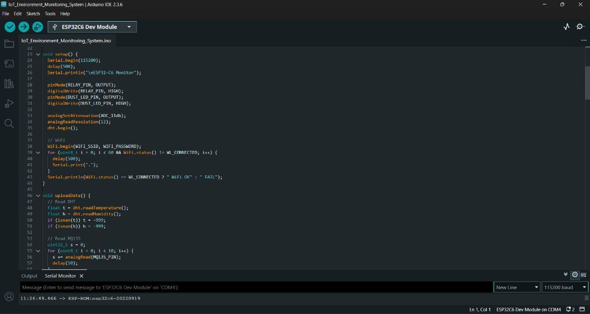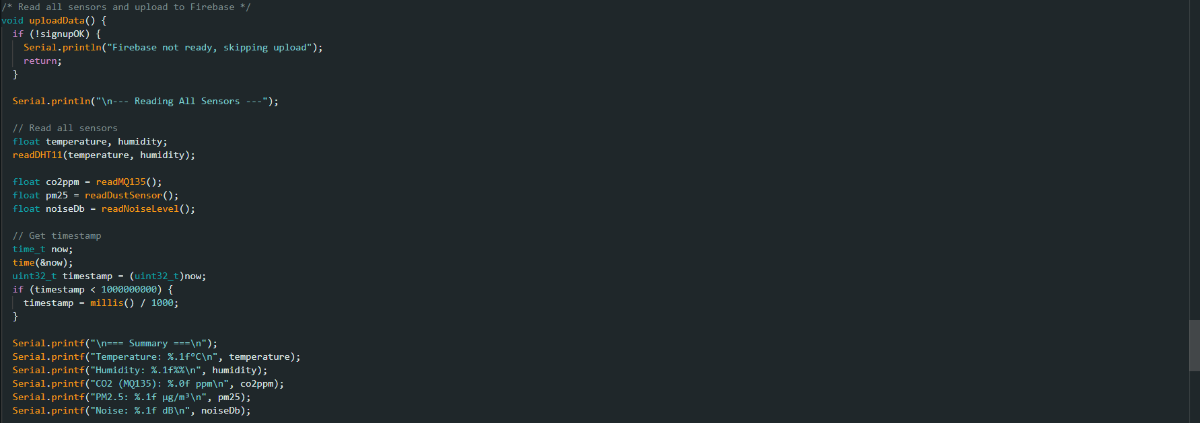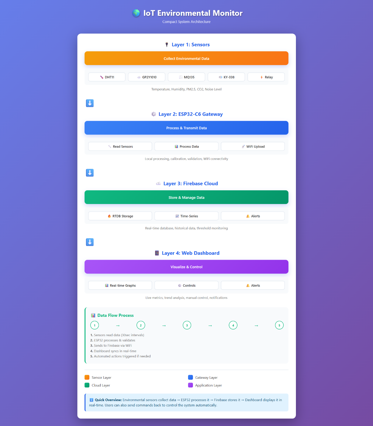 This IoT Environmental Monitoring System represents a complete, end-to-end solution for environmental awareness. From the carefully calibrated sensors that measure your physical environment, through the intelligent ESP32-C6 that processes the data, to the Firebase cloud backend that stores and serves it, every component works together seamlessly.