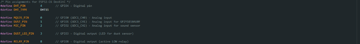 GPIO 4 ──────► DHT11 Data Line GPIO 0 ──────► MQ135 Analog Input GPIO 1 ──────► GP2Y1010 Analog Input GPIO 2 ──────► KY-038 Analog Input GPIO 3 ──────► 150ohm resistor ──────► Dust LED Control GPIO 8 ──────► Relay Module (active-LOW) |