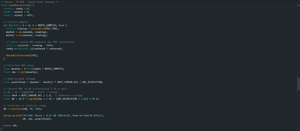 - Sensors measure parameters: temperature & humidity (DHT11), gas (MQ135), particulate matter (GP2Y1010AU0F) and noise(small microphone sensor)