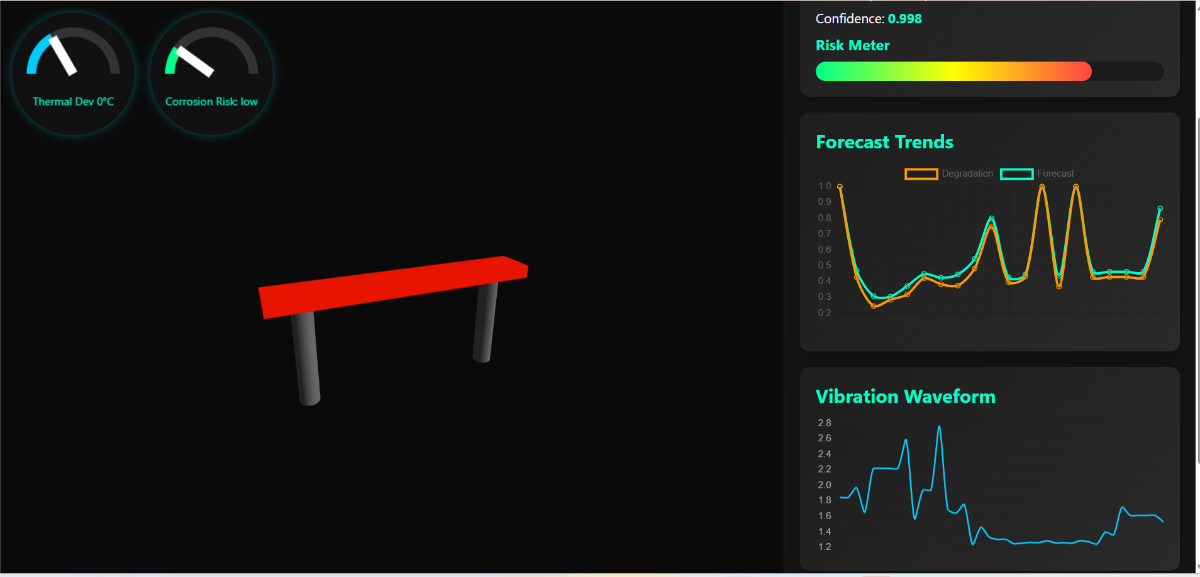 - Displays linked plots for vibration waveforms, degradation‑score history, forecast trends, temperature deviation bands, and corrosion‑risk levels derived from humidity exposure.
