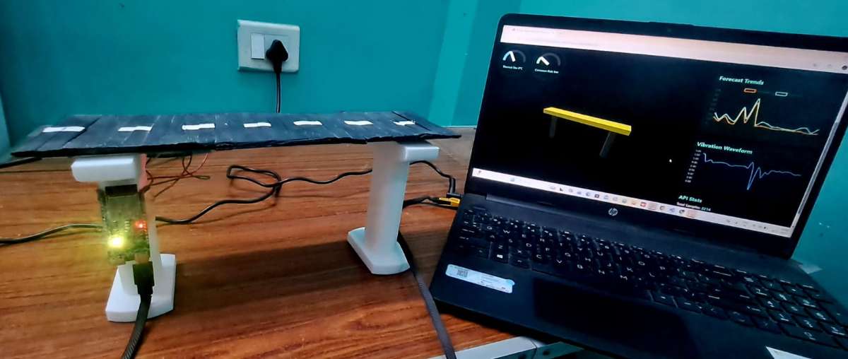 The proposed solution is an end‑to‑end structural health monitoring platform that transforms raw structural and environmental data into real‑time, interpretable intelligence for bridge safety and maintenance planning. Continuous measurements of vibration, motion, temperature, and humidity are converted into engineered features such as dominant frequency peaks, waveform statistics, degradation indicators, temperature deviation from baseline, and moisture‑driven corrosion risk indices. Machine learning models use these features to estimate a continuous degradation score and generate short‑term forecasts of how the score will evolve, enabling early detection of abnormal behavior and prediction of when a structure may transition from safe to warning or critical states.