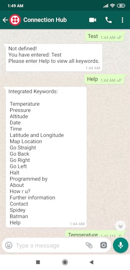 When you enter a specific keyword, which you can see below for each data on your dedicated database, on WhatsApp, this application will response that message by sending the requested variable associated with the keyword to your phone or transferring commands to the device.
