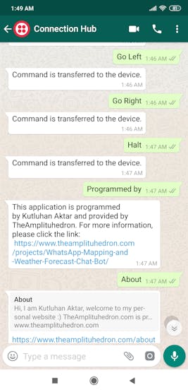 For a few weeks, I have been working with Twilio’s API, especially for WhatsApp messaging, and even created a project sending the variables coming from NodeMCU to my phone, which you can find here. But, my former project was merely sending data packets to my phone as WhatsApp messages periodically. And, I was determined to take my nascent idea and improve it by using WhatsApp response messages and a MySQL database and thus created this project. In that way, NodeMCU transfers variables to the phone as WhatsApp messages when the user requested them or gets commands from the user through WhatsApp. To manage that, I created a web application in PHP, which detects whether a WhatsApp message was sent or not and response the message depending on the keyword in the body. The application, named WhatsApp Two-Way Connection Hub, saves all variables transferred from NodeMCU and commands received from WhatsApp to a dedicated MySQL database and therefore communicates the user and NodeMCU instantly when something requested. I shared the source code of the application below if you want to use the localhost or your server instead of TheAmplituhedron to create a connection hub, but first, you have to download Twilio Helper Library in your directory.