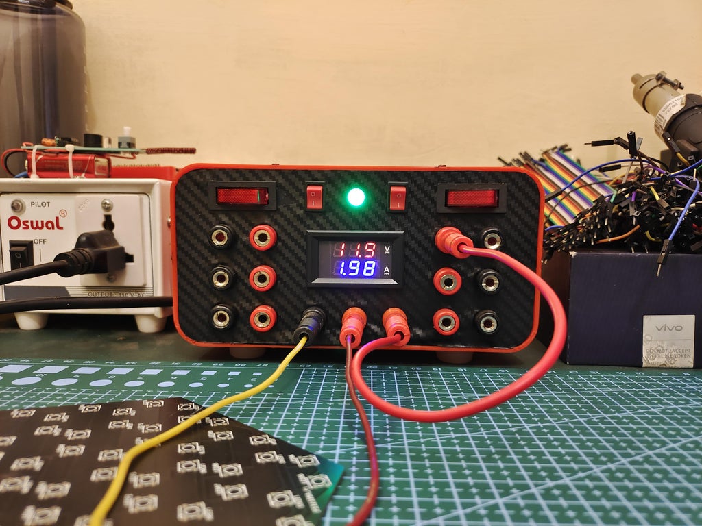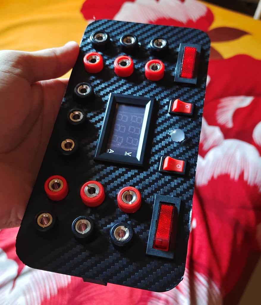 - Now add all the components(Banana Connectors, Switches and the Digital Meter) to the front panel.