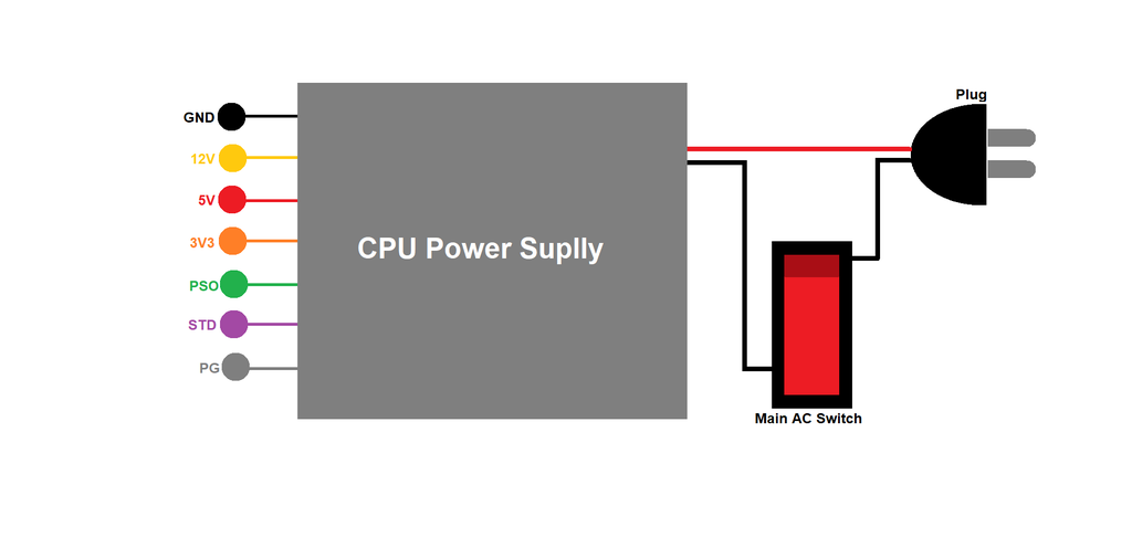 - PS-ON – (GREEN) – Power Switch On. Connect to Ground to turn on the power supply.