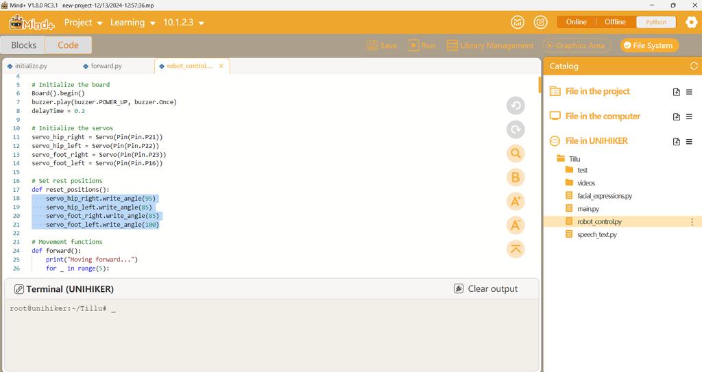 servo_foot_left.write_angle(100)Try modifying these values slightly to fine-tune the robot's posture and ensure proper movement. For example:
