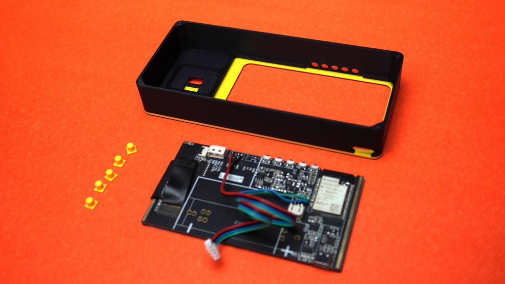 Carefully place the display inside the housing, ensuring that the buttons align properly and the USB Type-C port is accessible.