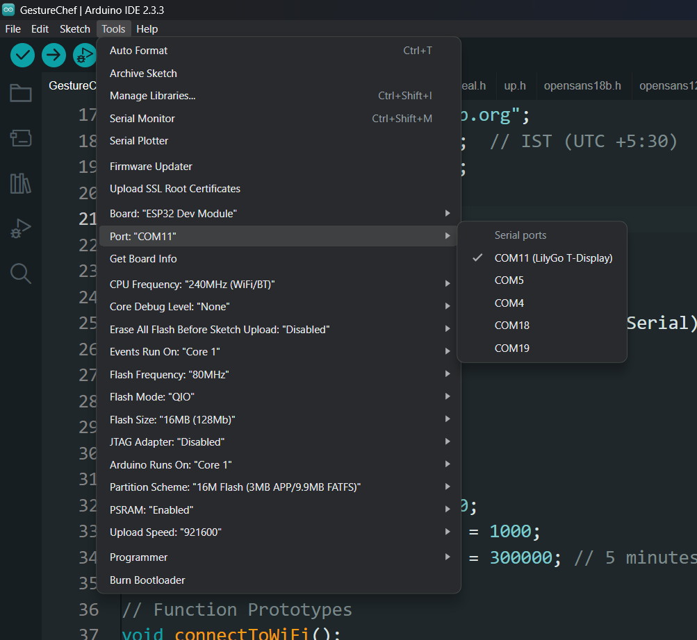 const long gmtOffset_sec = 19800; // IST (UTC +5:30)Select the settings in Arduino IDE as shown: