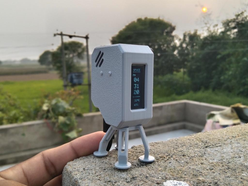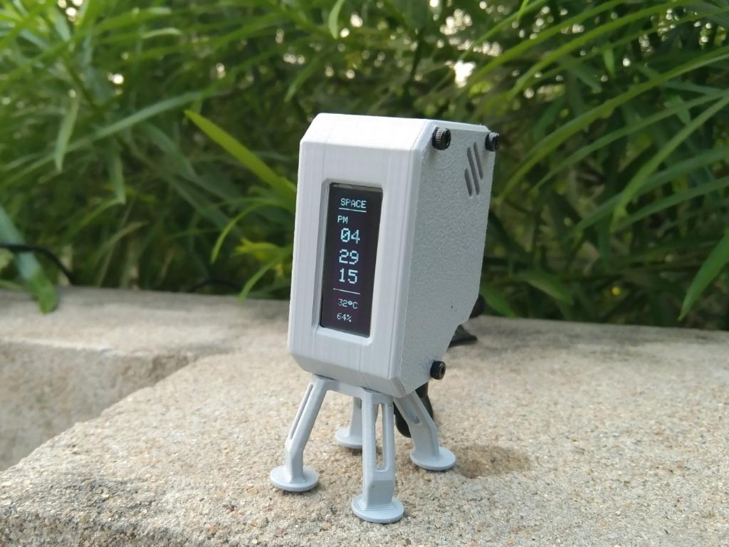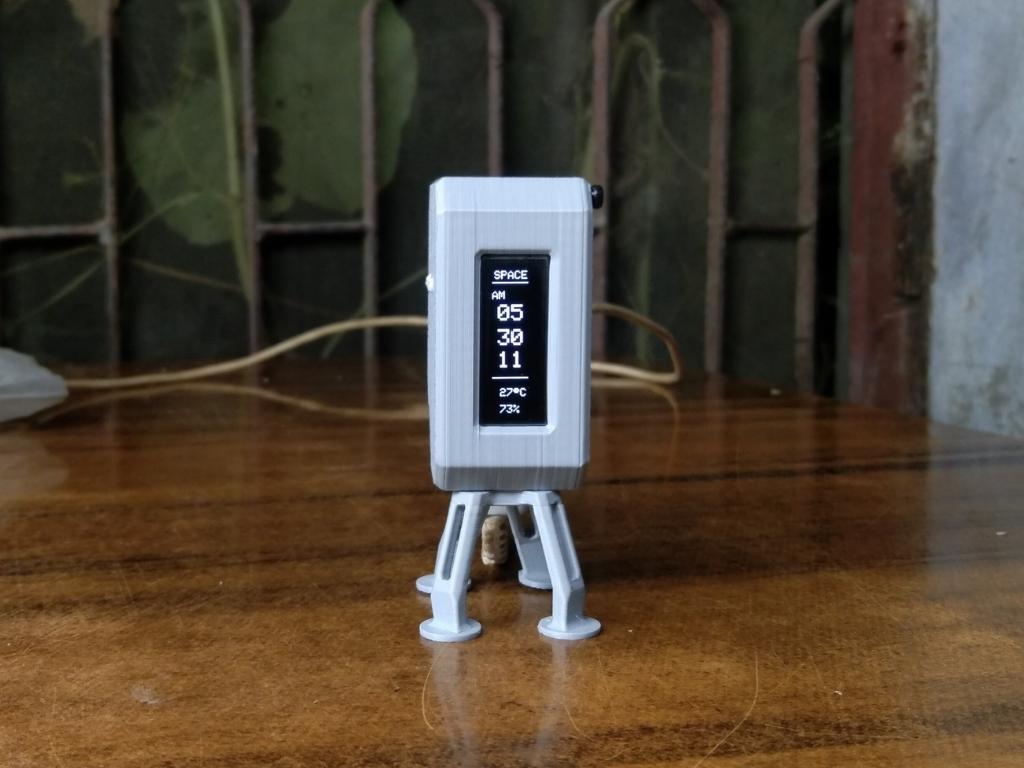 Designed in Autodesk Fusion 360, the OrbitClock’s 3D-printed body stands proudly on four landing-style legs, giving it the look of a mini spacecraft that just touched down on your table. On the front, a 0.91-inch OLED display shows a clean and futuristic readout labeled SPACE, featuring the current time, temperature, and humidity in real time.