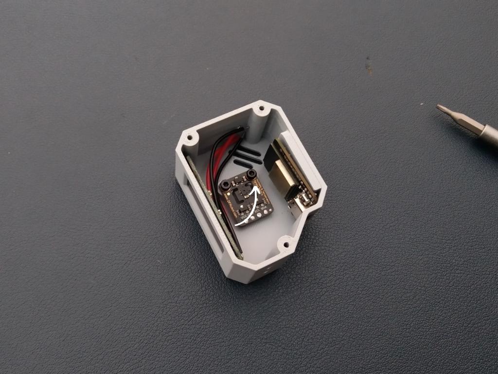 Once the microcontroller is in place, it’s time to install the final main component — the SHTC3 Temperature and Humidity Sensor. Carefully position the sensor in its dedicated slot inside the enclosure. Use two small M3 screws to secure it firmly with the help of a screwdriver. Make sure the sensor is properly aligned and tight enough so it stays fixed during use.