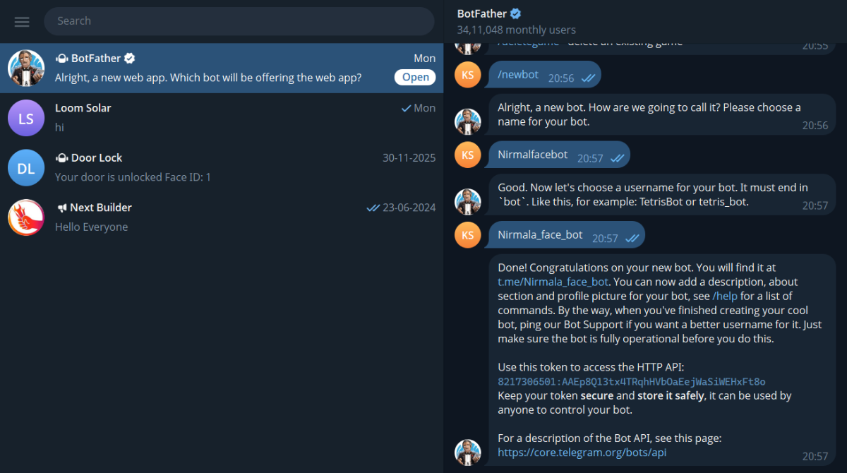 Once completed, BotFather will send you a congratulations message along with your Bot Token ID. Make sure to keep your token secure and store it safely, it can be used by anyone to control your bot, as well as it will be required later to connect your hardware with the bot.