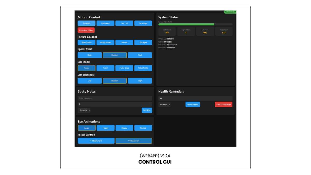 - Battery level, servo feedback, and system status on GUI (updates every ~2s)